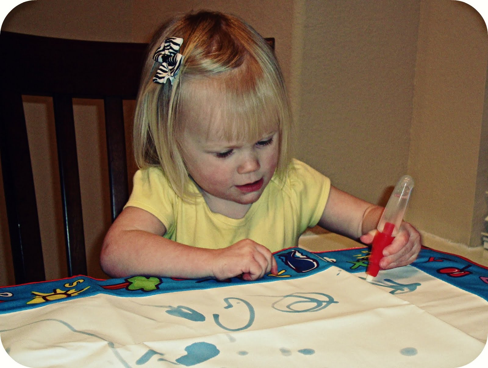 Since it is just water, there is really no mess. And, the mat can be laid on the floor or sat on the table and travels well. Notice, at almost 25 months, Abby still uses both her left and right hand for writing. God is still leaving that one as a surprise!
